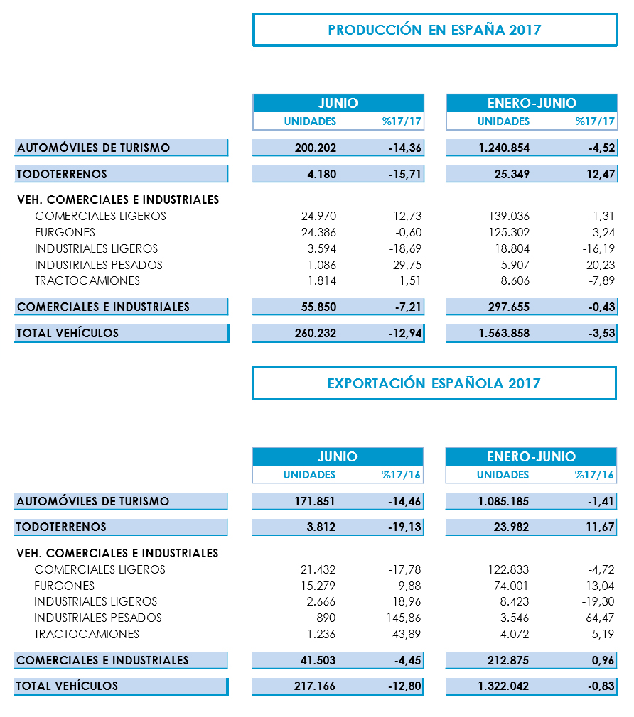 La producción en los segmentos de vehículos comerciales, industriales ligeros, industriales pesados y tractoras alcanzó las 55.850 unidades en junio, un 7,2% menos que en 2016. En lo que respecta al periodo enero – junio, se produjeron 297.655 unidades (-0,4%).