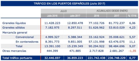 El tráfico de contenedores en los puertos españoles ha crecido un 6,77% en julio de 2017, con un total de 236.748.229 toneladas movilizadas en los siete primeros meses del año, sin tener en cuenta las cifras de los puertos de Algeciras y Las Palmas, que debido a la implantación de nuevas herramientas informáticas, no han podido incluirse.