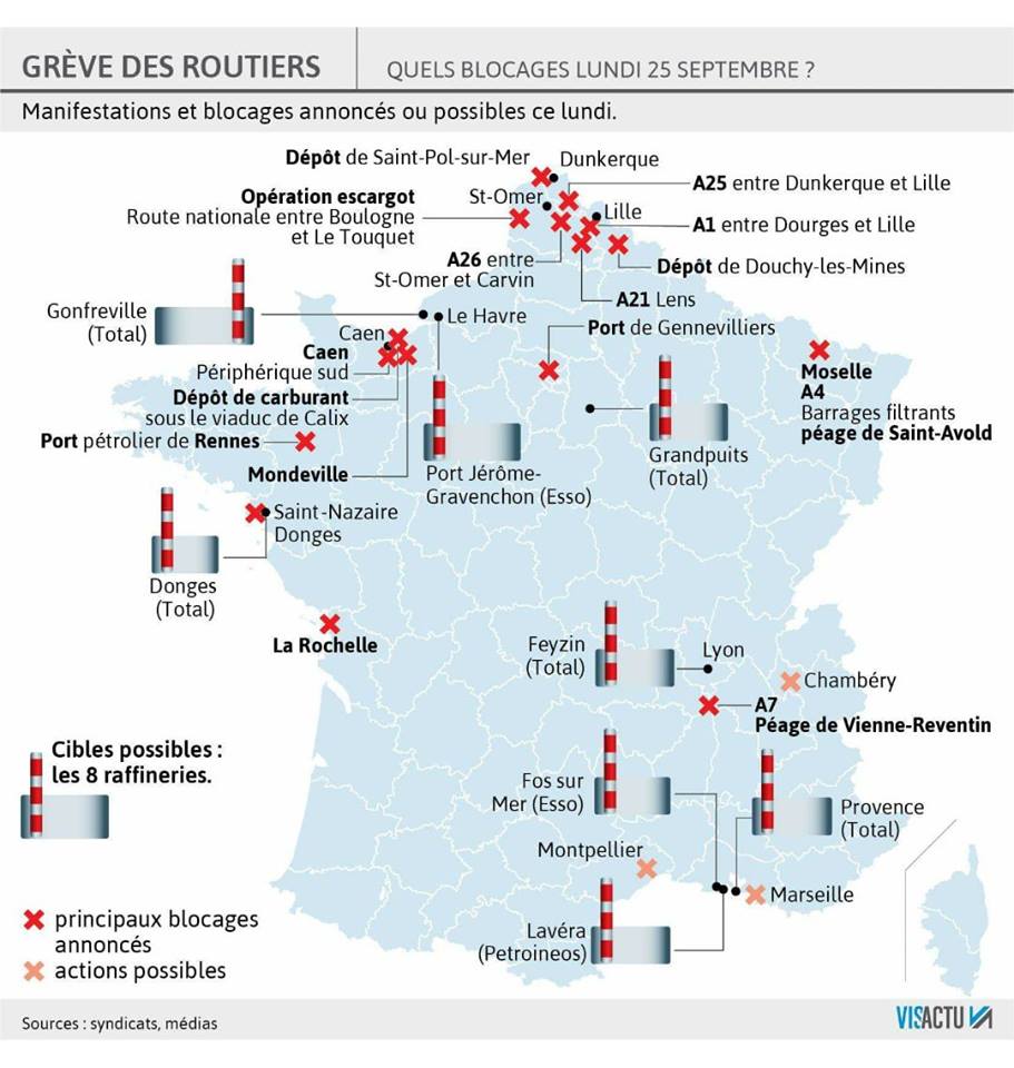 Hoy será un lunes negro en las carreteras francesas, la huelga convocada por los dos principales sindicatos CGT y FO, que engloban a la gran mayoría de los conductores del país tienen previsto llevar a cabo bloqueos, cortes y marchas tipo “caracol”, a las que esperan que se unan también los conductores de otros países, en protesta por la Ley Macron. Estos son los bloqueos y marchas previstas: