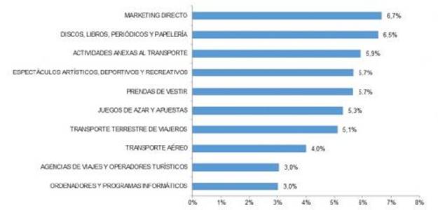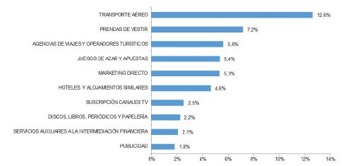 Las ramas de actividad con mayor volumen de negocio desde España hacia el exterior son el trasporte aéreo (un 12,6%), las prendas de vestir (7,2%) y las agencias de viajes y operadores turísticos (un 5,6%).