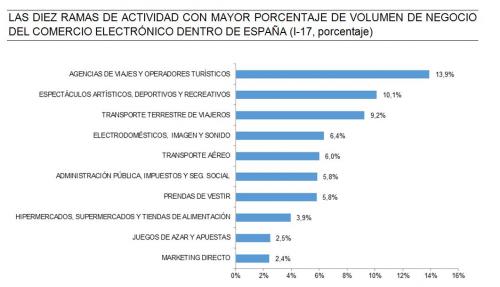 Los ingresos de comercio electrónico dentro de España (compras hechas en España a webs españolas) han aumentado un 21,0% interanual hasta los 2.633,8 millones de euros. El sector turístico supone el 30,4% de la facturación dentro de España, seguido de los espectáculos artísticos, deportivos y recreativos (10,1%), los electrodomésticos, imagen y sonido (6,4%) y la administración pública, impuestos y seguridad social (5,8%).