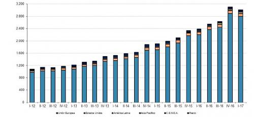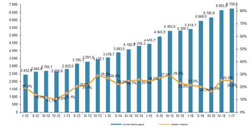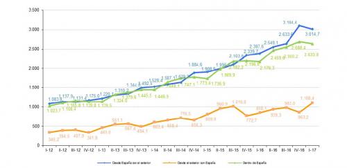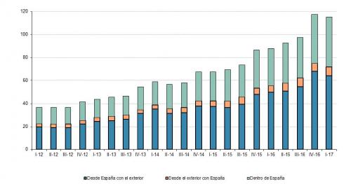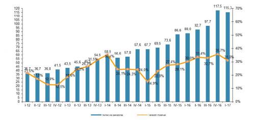 Si nos fijamos en el número de transacciones, en el primer trimestre de 2017 se han registrado más de 115 millones de transacciones, un 31,0% más. El marketing directo y los discos, libros, periódicos y papelería lideran el ranking por compraventas (6,7% y 6,5% respectivamente).