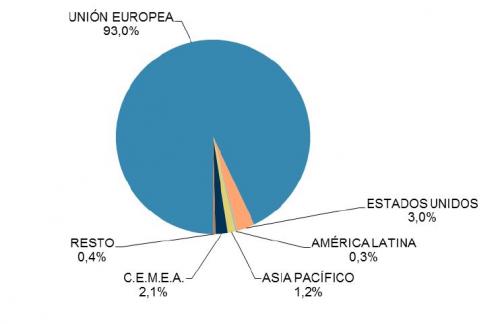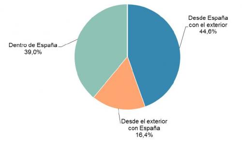 El volumen de negocio de las transacciones con origen en España y dirigidas hacia el exterior ha sido de 3.014,7 millones de euros, un 26,3% más que en el primer trimestre del año anterior. El 93,0% de las compras desde España hacia el exterior se dirigen a la Unión Europea, seguidas de Estados Unidos (3,0%).