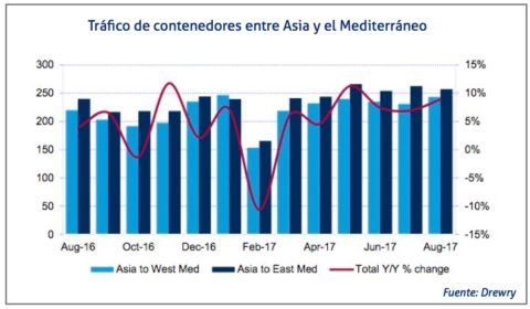 Por segundo año consecutivo, el comercio entre Asia y el Mediterráneo ha registrado un fuerte crecimiento de la demanda, superior a la existente entre el continente asiático y el norte de Europa, según recoge el último informe de la consultora Drewry.