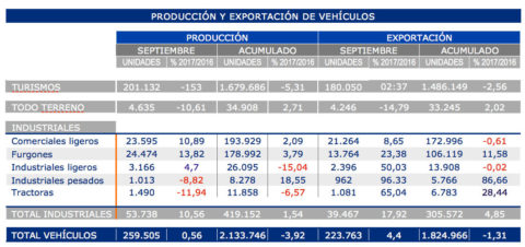 La producción de vehículos comerciales e industriales, por su parte, presenta un ascenso anual en septiembre del 10,56%, hasta colocarse en un volumen de producción de 53.738 unidades mensuales.