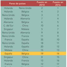 Además de los países europeos, cinco países asiáticos se encuentran entre los primeros 25 pares de países (ver tabla). Su presencia es más marcada en 2016 y 2010 que en 2006. Un análisis más profundo muestra que los 50 principales índices de conectividad bilateral de líneas marítimas solo se encuentran en conexiones entre 15 países y que los principales 250 índices son para conexiones entre 40 países.