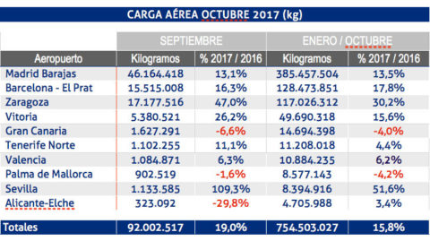 Durante el mes de octubre de 2017, los aeropuertos españoles de la red de Aena han transportado 92.002.517 kg. de carga aérea, lo que representa un crecimiento de un 19% más con respecto al mismo mes de 2016.