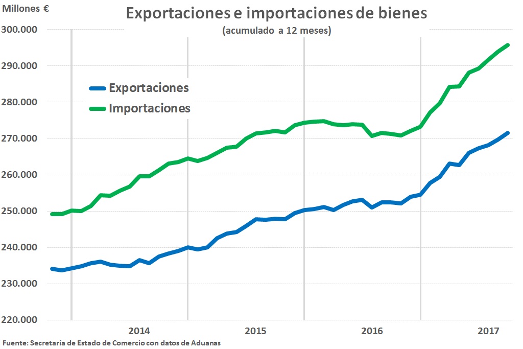 Las exportaciones españolas de mercancías en el periodo enero-septiembre ascendieron un 9,1% respecto al mismo periodo del año anterior y alcanzaron los 205.560 millones de euros, máximo histórico de la serie para el acumulado en este periodo. Las importaciones aumentaron un 11,1% hasta los 224.121 millones. Como resultado, el déficit comercial de los nueve primeros meses del año alcanzó los 18.562 millones de euros, un 40,3% superior que el registrado en el mismo periodo de 2016, pero es el tercer mejor saldo registrado en el acumulado de los nueve primeros meses del año desde 1997, sólo superado en 2013 y 2016. Las exportaciones españolas continúan registrando mejor evolución que las del conjunto de la zona euro y la Unión Europea.