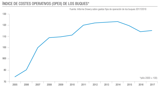 Drewry estima que los OPEX medios en los 44 tipos y tamaños de buques analizados en su informe aumentaron un 0,9% en 2017, tras una caída del 7,5% en el conjunto de los dos años precedentes. Dichos costes aumentaron para la mayoría de los tipos de buques, con la excepción de los portacontenedores, que consiguieron reducirlos por tercer año consecutivo.