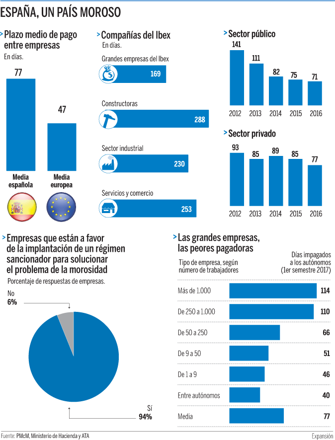 ¿En qué consistirá el régimen sancionador? Se impondrán multas a las compañías que incumplan la Ley de Morosidad de manera reiterada. En España se mueve un crédito comercial rayando en los 200.000 millones de euros anuales. De esa cantidad, un 60% se abona tarde a los proveedores (en la UE la media ronda el 30%). El sector privado tarda en pagar las facturas a sus proveedores 77 días, de media, 17 por encima de lo legal, que son 60 días. Las medias aritméticas suelen ser engañosas. Los periodos medios de pago de algunas grandes compañías se disparan. El último informe sobre la morosidad de las constructoras del Ibex marcaba plazos desde 181 hasta 536 días. Es decir, de entre seis y nueve veces lo legal.