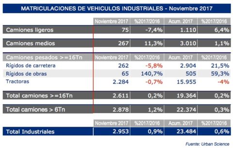 El mercado de vehículos industriales en España ha crecido un 0,9% en noviembre de 2017, con un total de 2.953 camiones matriculados, según los datos registrados por Aniacam.