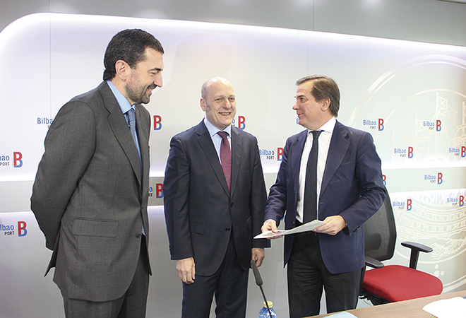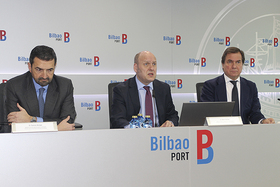 El presidente del Puerto de Bilbao, Asier Atutxa, acompañado del director, Carlos Alzaga, y del director de Operaciones, Comercial y Logística, Luis Gabiola, informó ayer de las estadísticas de tráfico correspondientes al ejercicio 2017, que con un total de 34,19 millones de euros y un incremento del 7,03% respecto a 2016, calificó como «bueno» y como señal de que la economía del territorio «está avanzando».