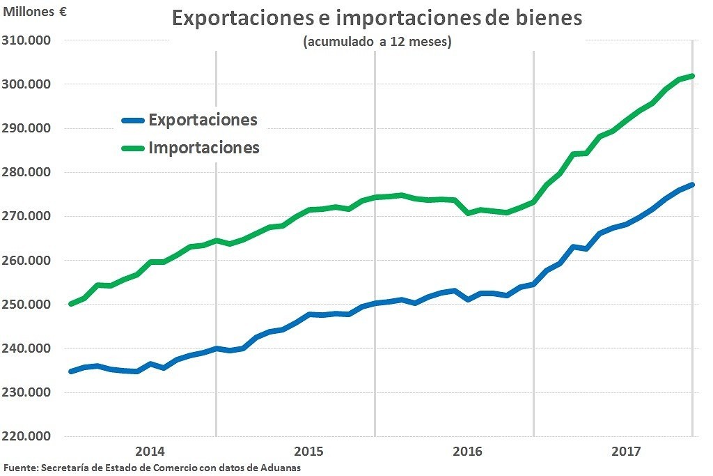 Las exportaciones españolas de mercancías crecieron en 2017 un 8,9% respecto al año 2016 y alcanzaron los 277.126 millones de euros con datos de comercio declarado, máximo histórico de la serie para el acumulado anual. Las importaciones aumentaron un 10,5% hasta los 301.870 millones, también en máximo histórico. Como resultado, el déficit comercial de 2017 alcanzó los 24.744 millones, un 31,9% más que en 2016. Las exportaciones españolas registraron mejor evolución que las del conjunto de la zona euro y la Unión Europea.