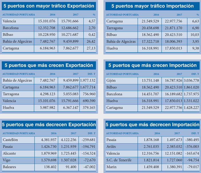 Por lo que respecta al tráfico de exportación, ascendió a 96,77 millones de toneladas (+7,42%), con el puerto de Valencia en los más alto del ránking al mover 15,79 millones de toneladas de exportación, un 4,57% más que en 2016.