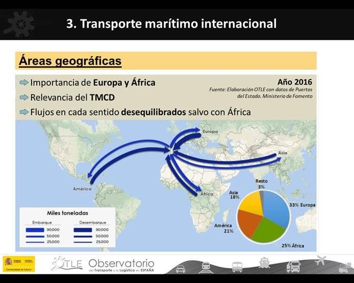 Según destaca el Observatorio del Transporte y la Logística, en 2016 el transporte de mercancías alcanzó las 1.283 millones de toneladas, registrando un crecimiento en todas las modalidades con excepción del transporte ferroviario, que cayó un 6%. El transporte por carretera, el marítimo y el aéreo crecieron un 2%, un 7% y un 4%, respectivamente.