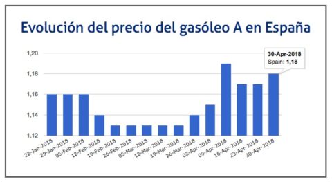 El precio del litro de gasóleo se ha incrementado por quinta semana consecutiva entre el 23 y el 30 de abril de 2018, situándose en los 1,183 euros, lo que supone un incremento del 0,85% respecto a los 1,173 euros que marcaba la semana anterior. De este modo, vuelve a superar su máximo anual, situándose en los mismos precios alcanzados en el verano de 2015.