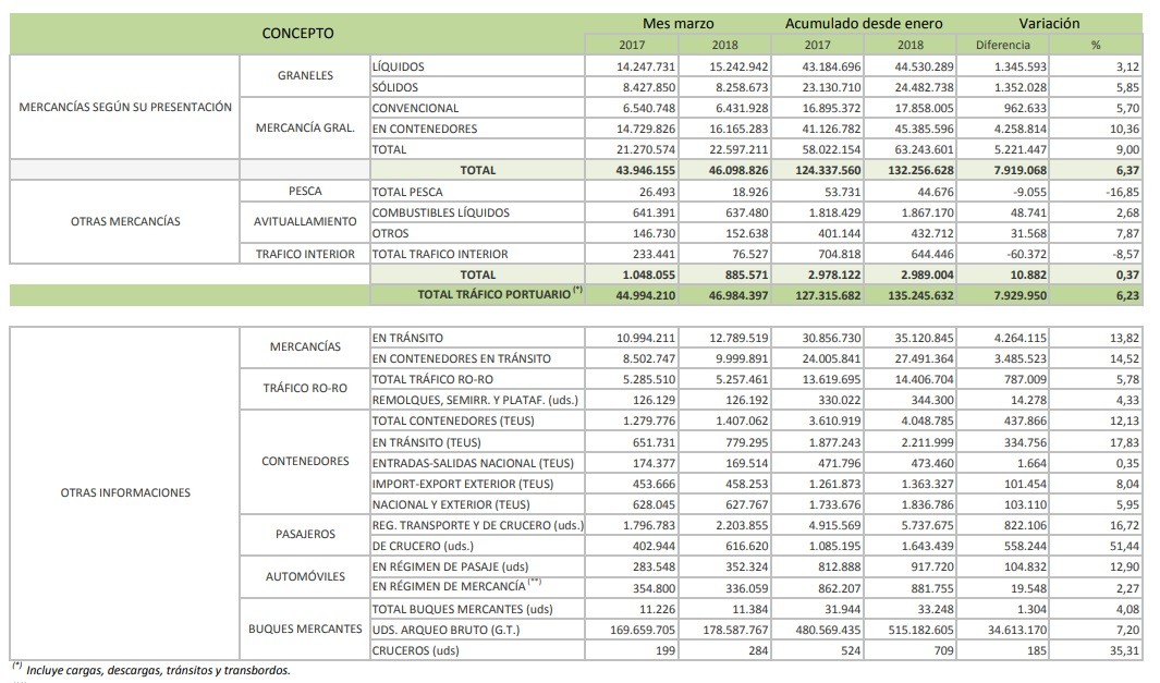 Los puertos españoles de titularidad estatal movieron, según las estadísticas publicadas por Puertos del Estado, en el conjunto de las 28 Autoridades, en el primer trimestre de este año 2018, un total de 132,2 millones de toneladas (Mt) de mercancías, un 6,3% más que en el mismo periodo de 2017. Todas las grandes partidas registraron aumentos sensibles, salvo la pesca, siendo la más notable la de los pasajeros de crucero (+51,4%), y los graneles líquidos los que crecieron de forma más moderada (+3,1%).
