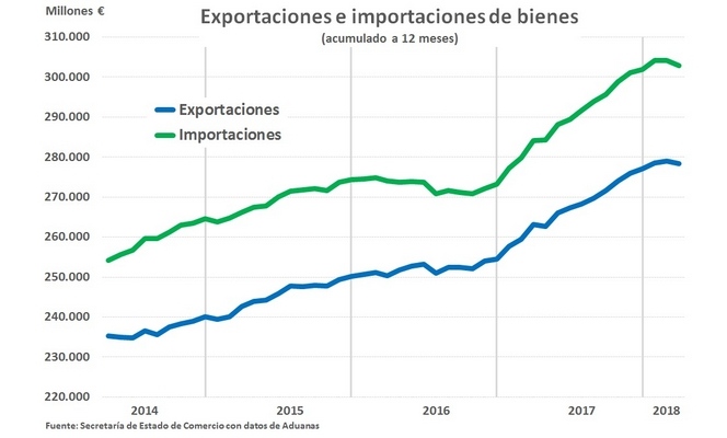 En el mes de marzo, las exportaciones españolas de mercancías se redujeron un 2,4% sobre el mismo mes de 2017, hasta los 25.606 millones de euros. Este dato tiene un fuerte efecto estacional debido a que en 2018 la Semana Santa tuvo lugar mayormente en marzo, mientras que en 2017 fue íntegramente en abril. Las importaciones cayeron un 4,5% en términos interanuales hasta los 26.436 millones de euros. Como resultado, en marzo de 2018 se registró un déficit de 831 millones de euros, un 43,1% inferior al del mismo mes de 2017.