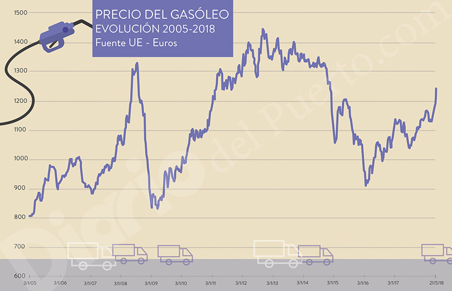 En su evolución, hay que destacar que en enero de 2017 el gasóleo alcanzó los 1,136 euros/litro para luego caer en la primera semana de julio a 1,039 euros, último retroceso hasta iniciar la actual e ininterrumpida escalada con un crecimiento en diez meses del 18%.