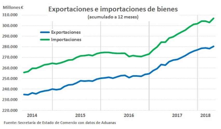 Las exportaciones españolas ya alcanzaron en 2017 su récord histórico con 277.126 millones de euros, con una subida del 8,9% respecto al año anterior, cifras que convirtieron a España en el país con mayor ritmo de crecimiento en el conjunto de la Unión Europea y de los países de la zona euro. Un récord que se prevé que sea superior en este 2018.