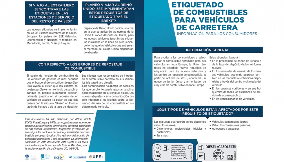 Con el fin de ayudar a los consumidores y a los concesionarios de vehículos y a las estaciones de servicio a entender estas nuevas etiquetas, las asociaciones la Asociación Española de Fabricantes de Automóviles y Camiones (Anfac), la Asociación Nacional de Empresas del Sector de Dos Ruedas (Anesdor), la Asociación Española de Operadores de Productos Petrolíferos (AOP) y la Unión de Petroleros Independientes (UPI) “han trabajado en estrecha colaboración para la traducción, redacción y publicación de unos folletos informativos, que serán presentados próximamente”, informaron en una nota de prensa conjunta los cuatro colectivos.