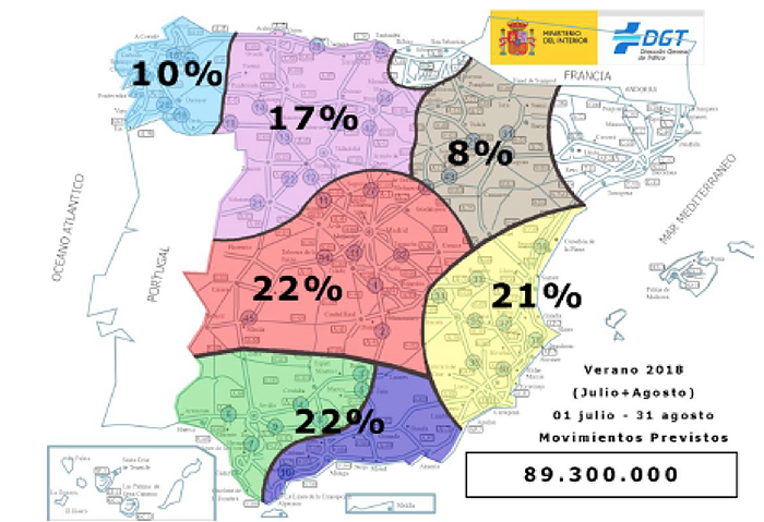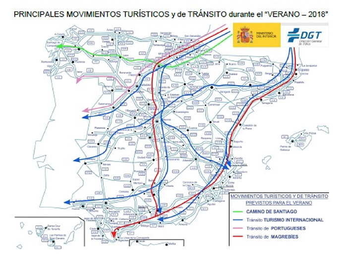 Además de los desplazamientos turísticos nacionales hacia zonas de costa, cuyas carreteras soportan mayores niveles circulatorios que en otras épocas del año, hay que tener en cuenta que España es país de tránsito para millones de ciudadanos provenientes de otros países europeos que regresan a sus países de origen en África. Muchos de ellos optan por desplazarse por carretera por lo que el Gobierno ha establecido un dispositivo especial para Paso del Estrecho que está operativo desde el pasado 15 de junio. Se prevén unos 700.000 desplazamientos en automóvil por carretera que atravesarán la Península.