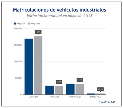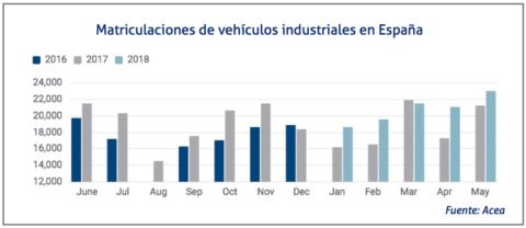 Las matriculaciones de vehículos industriales en la Unión Europea han registrado un modesto crecimiento del 3,3% en mayo de 2018 con 212.122 unidades, según datos de la Asociación Europea de Fabricantes de Automóviles, Acea. La demanda se ha mantenido relativamente estable en casi todos los mercados, con un destacado aumento del 8,3% en España y algo menor, del 2,1%, en Francia.