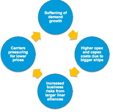 El aumento del riesgo fue otro factor clave que identificamos como parte de la tormenta perfecta, y este es un factor que es cierto. En particular, la formación de un pequeño número de grandes alianzas de transporte marítimo de línea, junto con la consolidación del sector del transporte marítimo de línea a través de la actividad de fusiones y adquisiciones, ha dado lugar a una importante volatilidad de las cuotas de mercado de los operadores de terminales.