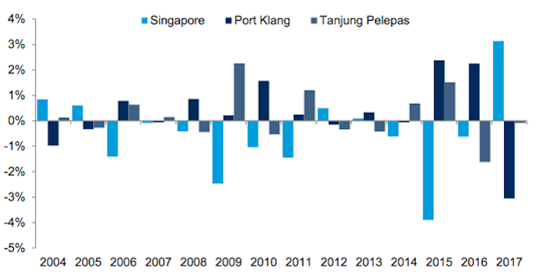 Por ejemplo, en el mercado de transbordo del sudeste asiático, como se ilustra en la Figura 3, después de un largo período en el que sólo se produjeron cambios menores en la cuota de mercado (aparte de la crisis financiera mundial de 2009, en la que, hasta cierto punto, todas las apuestas estaban descartadas), los tres puertos competidores de Singapur, Tanjung Pelepas y Port Klang han experimentado una volatilidad mucho mayor de la cuota de mercado desde 2015. Primero se alejó abruptamente de Singapur, siendo Port Klang el principal ganador, pero en 2017 el péndulo volvió a girar bruscamente hacia Singapur.