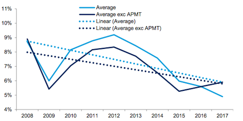 Las compañías portuarias y de terminales de muestra en el análisis ROIC son una buena muestra representativa de la industria, aunque debido a que el ROIC de APM Terminals cayó en territorio negativo en 2017 (debido a los grandes cargos por deterioro que totalizan más de $600 millones en mercados comercialmente desafiados), hemos mostrado el ROIC promedio de muestra con y sin APMT. En cualquier caso, la tendencia a la baja es evidente, aunque con un ligero repunte en 2016 y 2017 cuando se excluye el APMT. Significativamente, el ROIC promedio en 2016 y 2017 fue poco diferente al experimentado en 2009, el año en que la industria portuaria de contenedores vio el único año de disminución de volúmenes en su historia. Dicho esto, un ROIC típico del 6% es uno que la mayoría de las compañías navieras envidiarían.