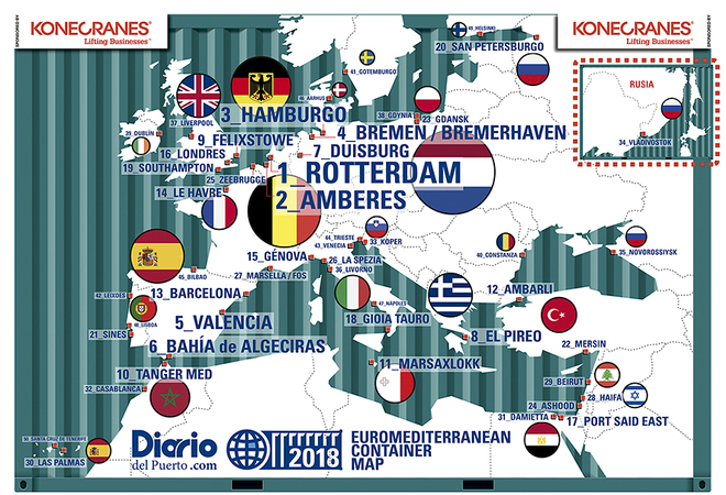 De acuerdo con el “EuroMediterranean World Container Map 2018”, los 50 puertos más importantes en esta región por tráfico de contenedores movieron en 2017 un total de 117,51 millones de TEUs, lo que con respecto a los tráficos de estos mismos enclaves en 2016 comporta un crecimiento del 6,12% tras mover cerca de 6 millones de TEUs más.