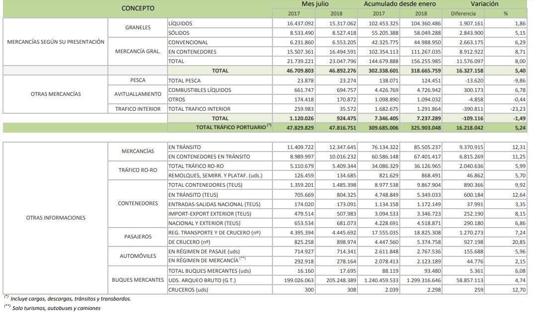 Según los datos publicados por Puertos de Estado, durante los 7 primeros meses del año los puertos españoles de interés general movieron un total de 318,7 millones de toneladas (Mt) de mercancías, un 5,4% más que en el mismo periodo del año anterior. El tonelaje movido volvió a alcanzar cifras record, si bien las tasas de crecimiento acumulado son menores que en los primeros meses del año. La mercancía general supuso el 49,0% de las cargas, seguida de los graneles líquidos (32,8%) y sólidos (18,2%).