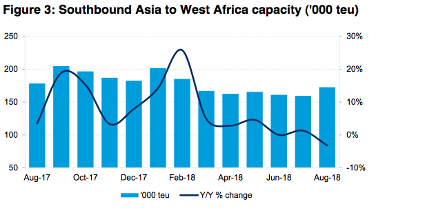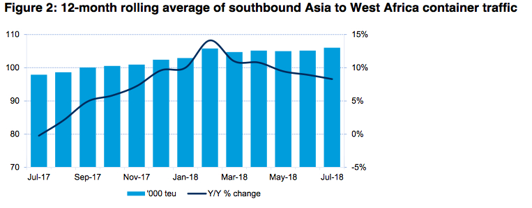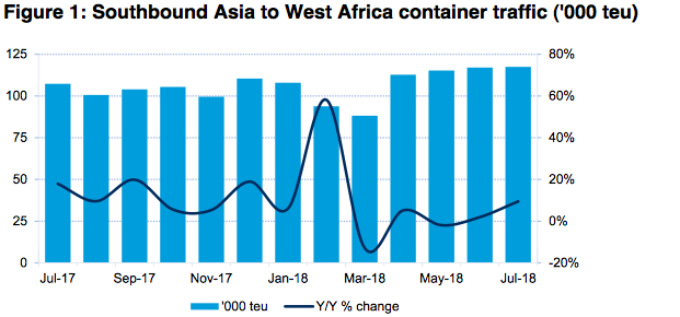 Los envíos de contenedores con destino al sur de Asia a África occidental en los primeros siete meses de 2018 registraron un ritmo de crecimiento igualmente rápido como el del año pasado, impulsado en gran medida por la revitalización de economías clave como Nigeria y Angola, que se están beneficiando del aumento de los ingresos derivados del petróleo.