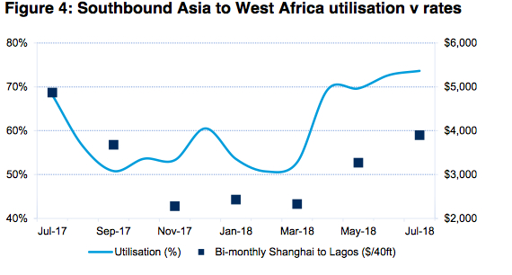 El enfoque más cauteloso de los transportistas con respecto a la capacidad este año sugiere que podrían haber aprendido una lección del año pasado cuando suministraron en exceso al mercado. La utilización de barcos en la ruta de Asia hacia el sur a África Occidental, tanto en junio como en julio, fue la más alta de los últimos cinco años, lo que ayudó a que las tarifas al contado aumentaran a 4.000 dólares por contenedor de 40 pies, según informó Drewry’s Container Freight Rate Insight (véase el Gráfico 4).