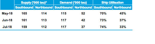 Dado el extraordinario ritmo de crecimiento observado el año pasado, siempre fue probable que las cosas se ralentizaran este año; aunque nuestro promedio móvil de 12 meses de volumen de contenedores se dirige hacia el sur, se mantiene en una posición saludable basada en los últimos datos disponibles para julio de 2018, alrededor de un 8% por encima del mismo mes del año pasado (ver Figura 2).