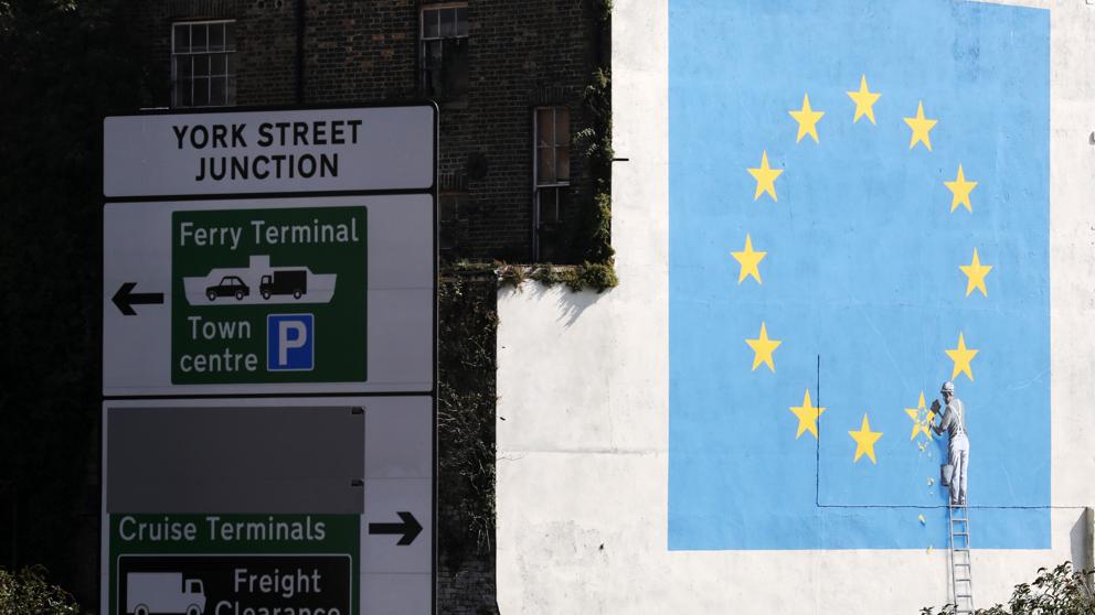 Cuando se votó el Brexit, en lo alto de un acantilado apareció una efigie gigante de Theresa May con la Union Jack y haciendo el gesto de la V de la victoria, estilo Churchill. Ahora, un mural de Banksy estilo trampantojo muestra a un trabajador retirando una de las estrellas de la bandera de la Unión Europea.