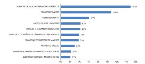 Los sectores de actividad con mayores ingresos han sido las agencias de viajes y operadores turísticos, con el 14,9% de la facturación total; el transporte aéreo, con el 10,8% y las prendas de vestir, en tercer lugar, con el 6,1%.