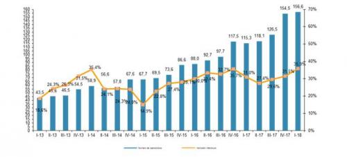 Si nos fijamos en el número de transacciones, en el primer trimestre de 2018 se han registrado más de 156 millones de transacciones, un 35,9% más. Los juegos de azar y apuestas lideran el ranking por compraventas (7,1%).