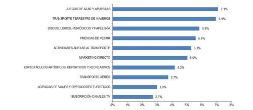Las ramas de actividad con mayor volumen de negocio desde España hacia el exterior son el trasporte aéreo (un 13,1%), las prendas de vestir (7,4%) y los juegos de azar y apuestas (un 6,2%).