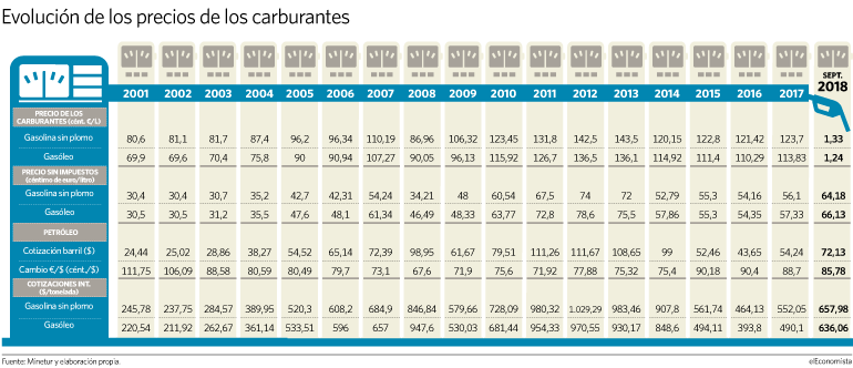 Los precios actuales se sitúan diez céntimos por encima de la media del año pasado para la gasolina y doce céntimos más altos para el diésel por culpa del fuerte incremento del barril de petróleo, que hasta septiembre se ha pagado de media en España a 72,13 dólares frente a los 54,24 dólares de media de 2017.
