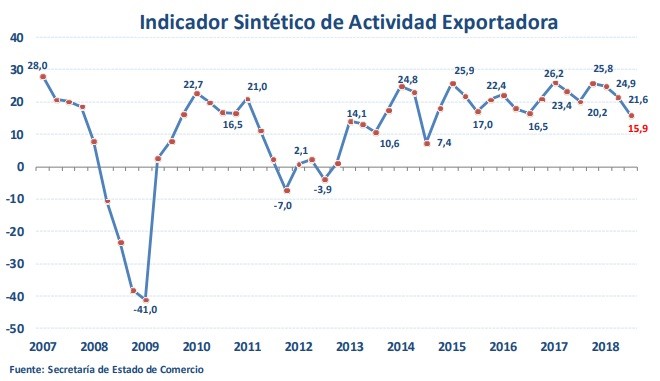 Las empresas exportadoras revisan a la baja la percepción sobre el comportamiento de la cartera de pedidos en el trimestre y mantienen sin apenas variaciones sus expectativas para los próximos tres y doce meses. Esta evolución ha dado lugar a una reducción del Indicador Sintético de Actividad Exportadora (ISAE), que se sitúa en 15,9 puntos (21,6 en el trimestre anterior).