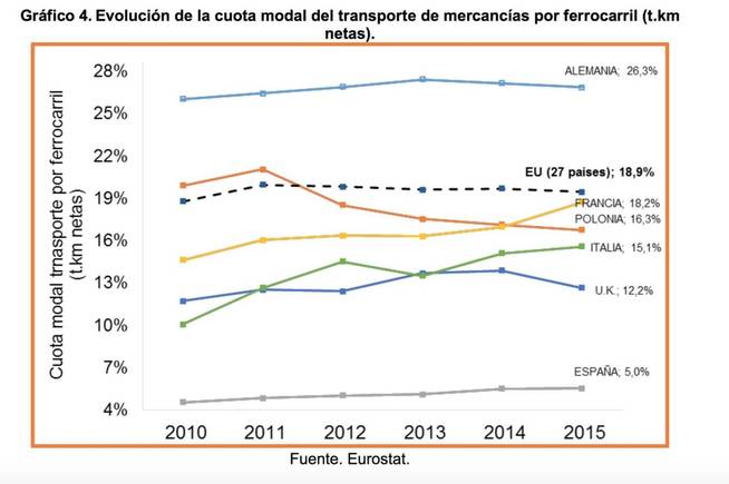 España está a años luz de cumplir con las recomendaciones del llamado Libro Blanco de la Comisión Europea, que marca como hitos sustituir el 30% del transporte por carretera a distancias superiores a los 300 km por el ferrocarril para 2030 y del 50% para 2050. El primer borrador de Ley de Cambio Climático y Transición Energética presentado por el Ministerio de Energía y Medio Ambiente de Teresa Ribera apenas hace referencia a esta cuestión. Tampoco la proposición de ley presentada por Podemos en el Congreso de los Diputados concreta medidas para reducir la dependencia del transporte de mercancías por carreteras, más allá de recordar los objetivos del Libro Blanco.