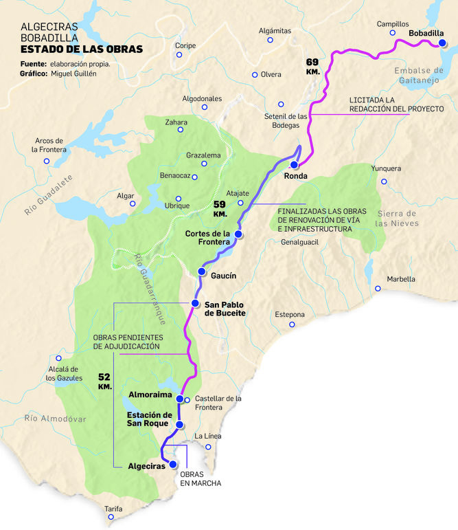 En la actualidad se están desarrollando obras en el entorno de la estación de San Roque y está en proceso de adjudicación la actuación en el siguiente tramo, Almoraima-San Pablo, licitada por un presupuesto de 15.361.276,59 euros. Estas obras contemplan la renovación de la vía y la infraestructura a lo largo de 26,7 kilómetros de la línea, así como de las vías de apartado en las estaciones, salvo en Jimena de la Frontera, que será objeto de una nueva fase.