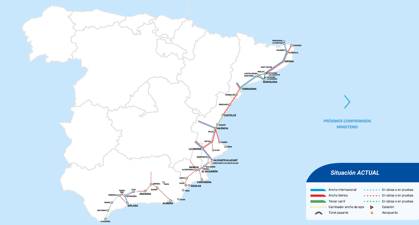Esta actuación propiciará la circulación en ancho internacional desde Almería a la frontera francesa, pero está pendiente la doble plataforma entre Castellón y Tarragona -una para mercancías y otra para pasajeros-. El plan es convertir la actual doble vía de ancho ibérico a internacional pero esto no solventa los problemas de saturación porque se compartirán las mismas vías para los tránsitos de mercancías y los de pasajeros. Como solución provisional, Fomento se plantea alquilar vagones con ejes internacionales para que los operadores puedan transitar por el tramo entre Castellón y Vandellòs, explica el diario.