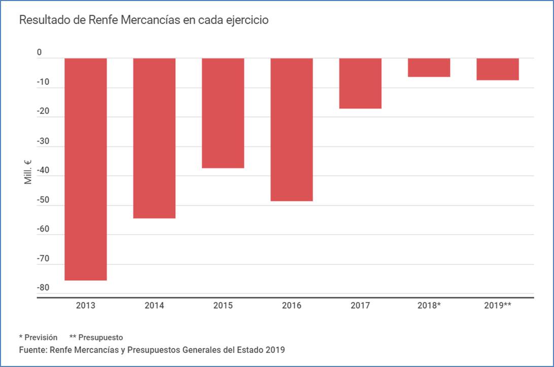 Las previsiones del proyecto de Presupuestos Generales del Estado para 2019, que difícilmente verán la luz dada la situación política actual, avanzan unas pérdidas de Renfe Mercancías de 7,4 millones de euros para finales de este ejercicio. Esta cifra, sumada a las registradas desde 2013, arrojan unas pérdidas acumuladas de prácticamente 246 millones de euros en este periodo. Esta situación económica sitúa a la empresa con un balance débil para afrontar los retos actuales.