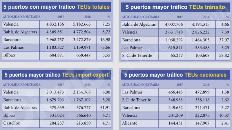 En cuanto a los TEUs en tránsito, que en 2018 alcanzaron los 9,28 millones con un crecimiento del 9,24%, la Autoridad Portuaria de la Bahía de Algeciras lideró el ránking con 4,19 millones de TEUs, seguida de Valencia con 2,82 millones, Barcelona con 1,46 millones, Las Palmas con 583.488 TEUs y Santa Cruz de Tenerife con 103.608 TEUs.