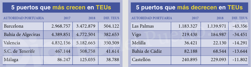 Un año más el puerto que más creció en contenedores fue Barcelona con 504.122 TEUs más, seguido de Algeciras con 382.653 TEUs más, Valencia con 350.509 TEUs más, Tenerife con 41.614 TEUs más y Málaga con 38.788 TEUs más.