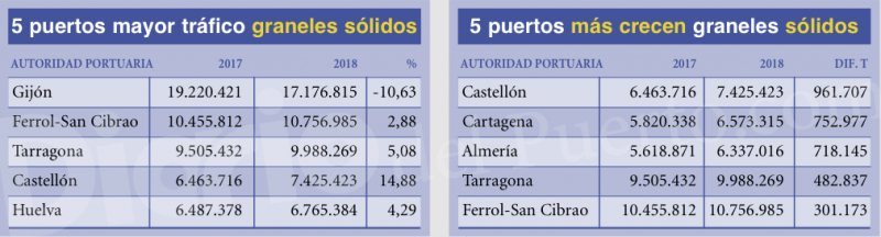 Precisamente el Puerto de Castellón fue el que más creció en toneladas en 2018 en el apartado de graneles sólidos tras mover 961.707 toneladas más que en 2017. Entre los puertos que más crecieron en graneles sólidos también están Cartagena, Almería, Tarragona y Ferrol.