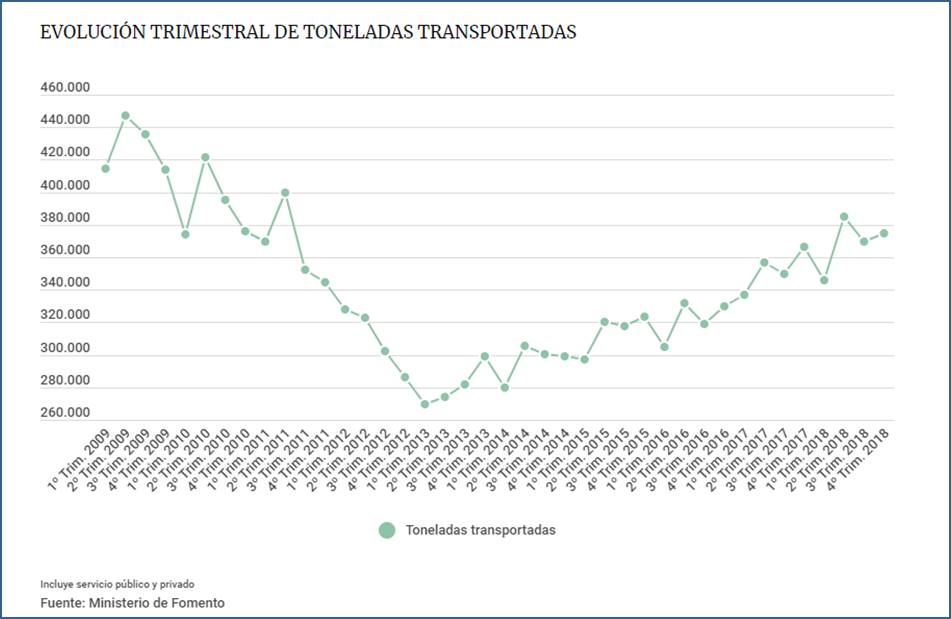 El movimiento de minerales y materiales de construcción han sido los principales contribuyentes de este incremento de actividad. Este segmento ha sumado 514 millones de toneladas en 2018, el 7% más. De todos modos, aún está muy lejos de las cifras que se registraban antes el inicio de la crisis: superaba holgadamente los 1.500 millones de toneladas en 2007. También han crecido los vehículos y productos manufacturados, los productos alimenticios y los petrolíferos. Sin embargo, han disminuido los productos agrícolas y los que se agrupan bajo el epígrafe “otras mercancías”.