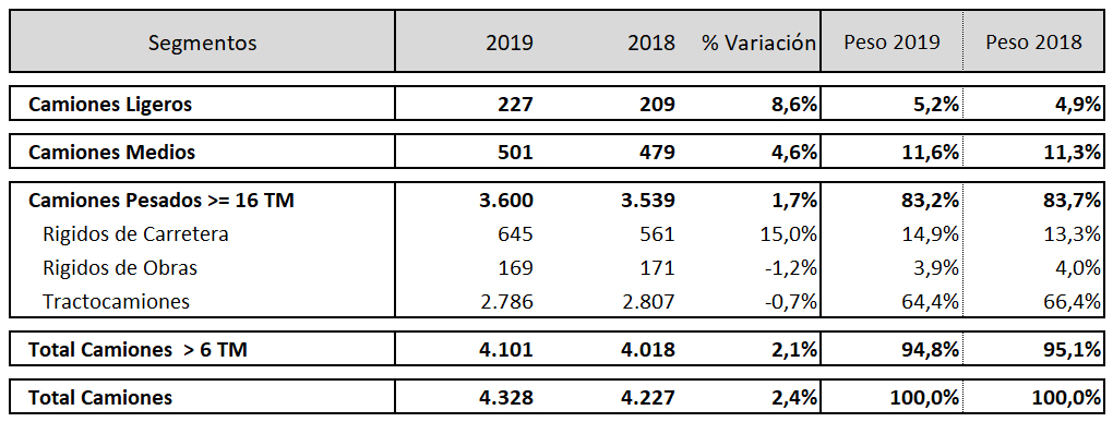 El mercado de camiones ha crecido un 2,4% en 2019 (4.328 matriculadas) Evolución matriculaciones (Enero - Febrero): 2010 - 1.971 2011 - 2.791 2012 - 2.257 2013 - 1.907 2014 - 2.623 2015 - 3.096 2016 - 4.087 2017 - 3.880 2018 - 4.214 2019 - 4.328